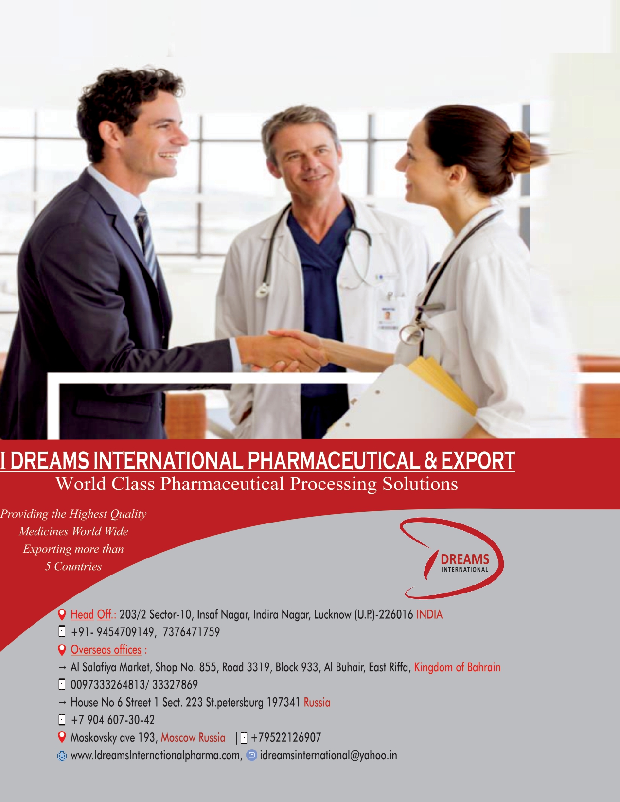 I Dreams International Pharmaceuticals is one of the highly reputed best pharmaceutical companey in India the company has office's not only india but also abroad kingdom of bahrain and russia federation that entered in the market in 2010 With the primary goal of improving society's healthcare globaly with a plethora of high-quality medicines and business opportunities. I Dreams International Pharmaceuticals has been a well known name in the pharmaceutical industry since it is transforming the health sector with high-quality medicines. The organisation is now active in a variety of business activities such as manufacturing and PCD franchise business, and we are pleased to cutting-edge technology.